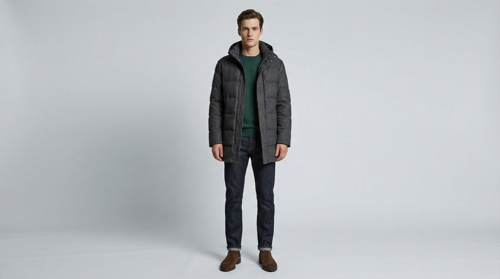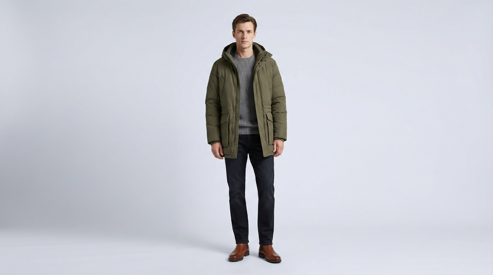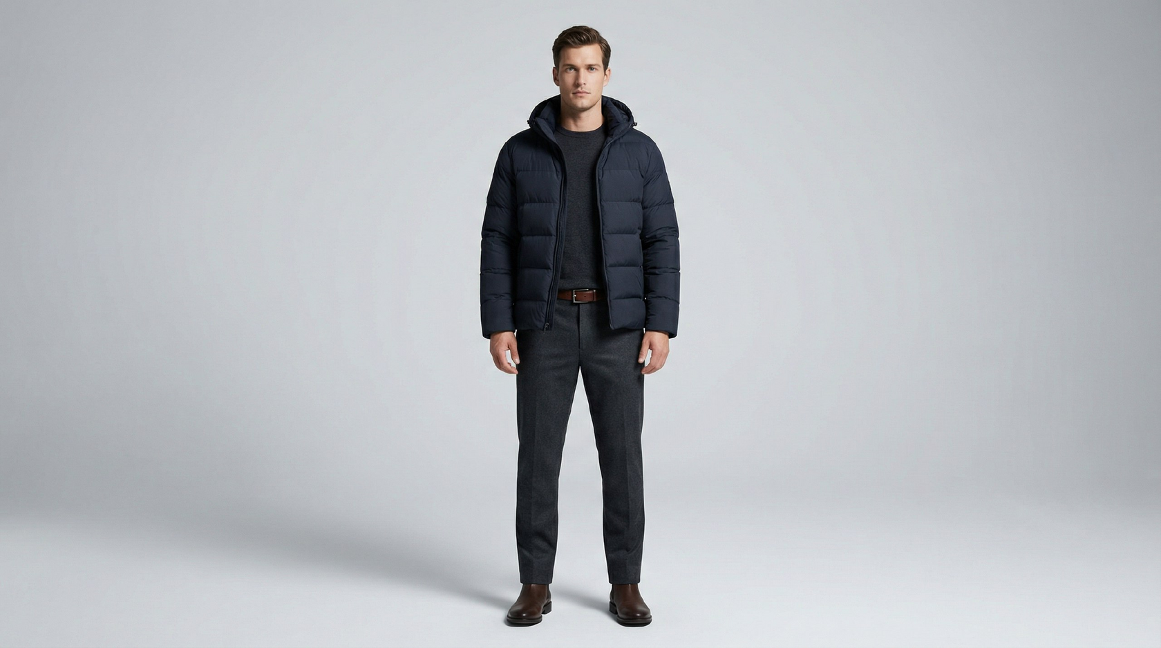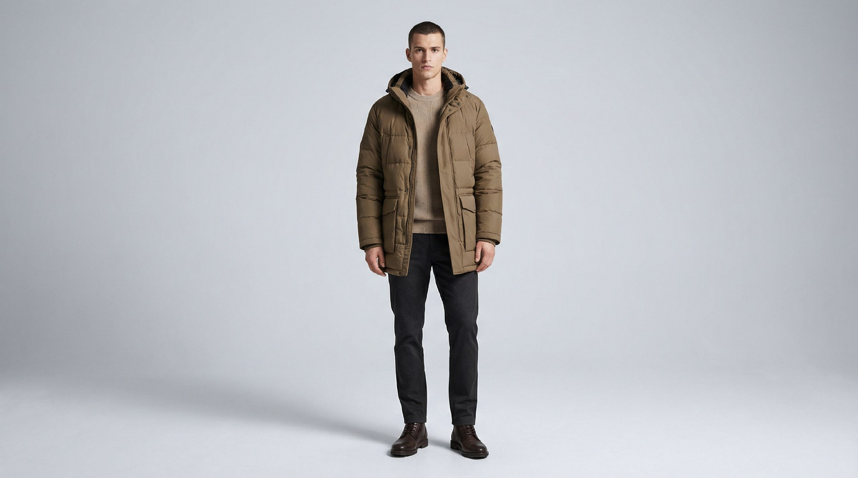 Поэтому в центре мужского гардероба остаются куртки, пуховики и утеплённые пальто, но сами образы становятся визуально легче и аккуратнее.